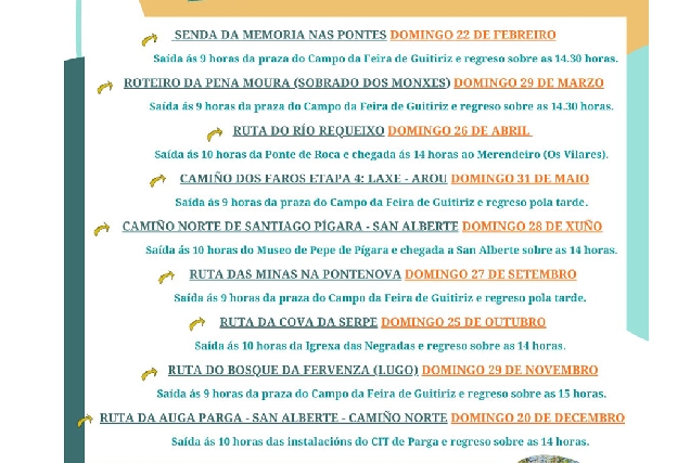 O 15 de marzo está prevista unha saída a Congosto, no Bierzo, mentres que o 19 de abril a actividade trasladarase a Vilalba