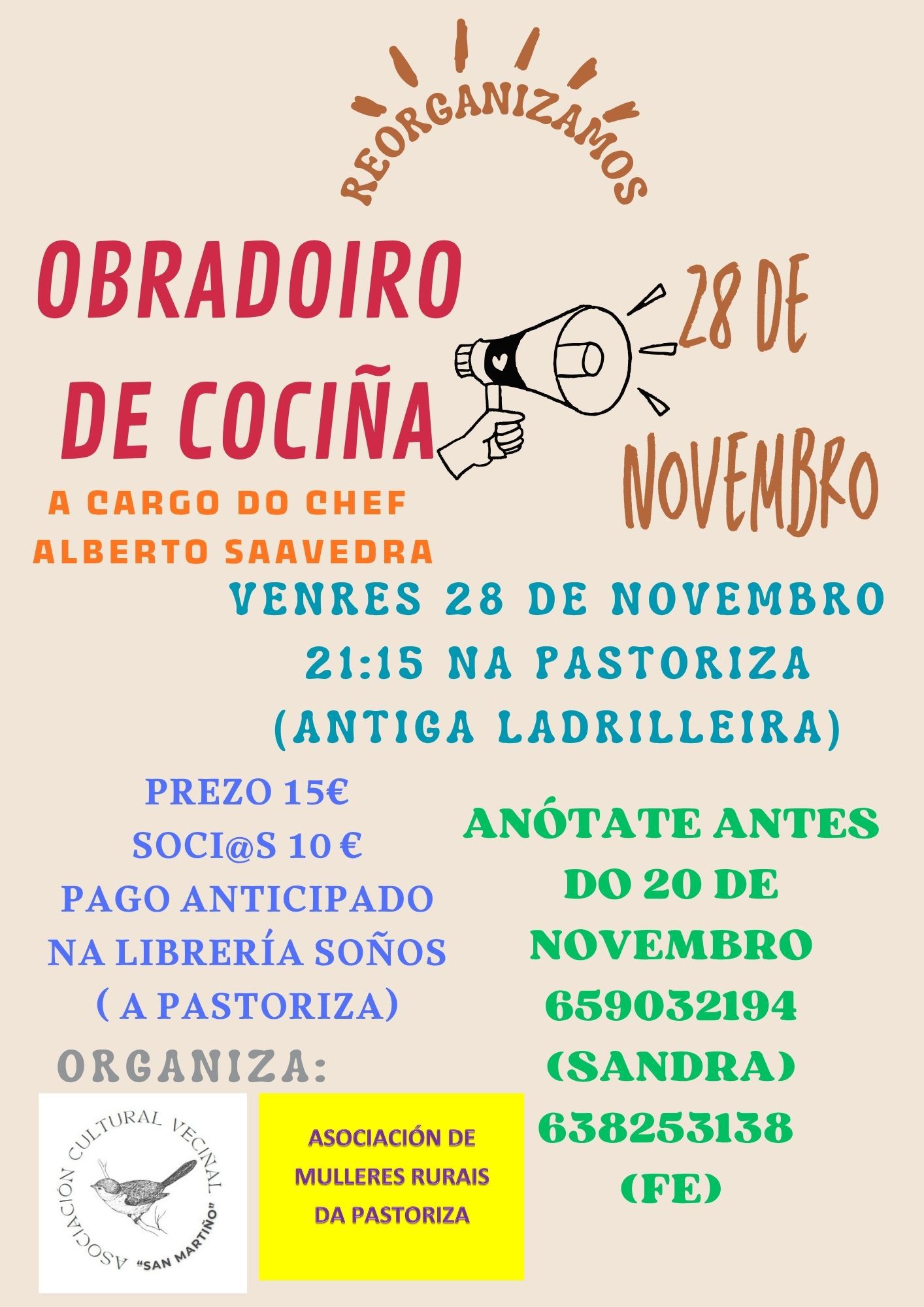La Asociación de Mujeres Rurales de A Pastoriza ha reabierto el plazo de inscripción para el Taller de Cocina que tuvo que ser aplazado en su momento. El curso, a cargo del chef Alberto Saavedra, se llevará a cabo el viernes 28 de noviembre a las 21.15 horas en el local de A Pastoriza (antigua Ladrilleira).