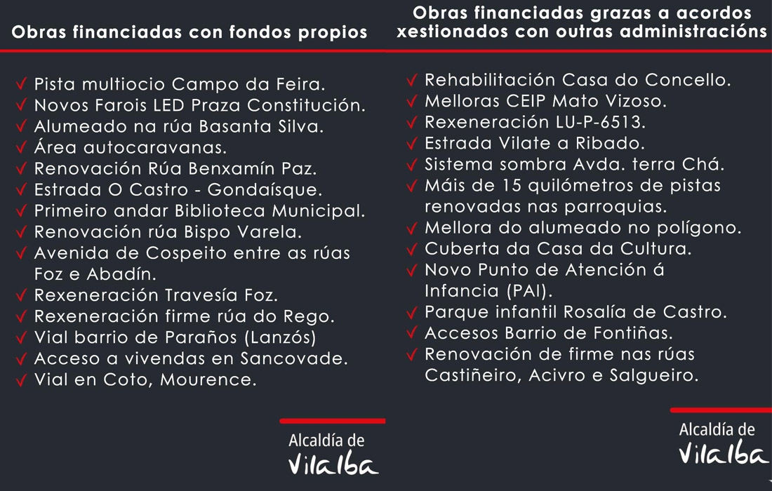 Entre as obras financiadas no ano 2025 con fondos propios, están a pista multiocio do Campo da Feira; os novos Farois LED da praza Constitución; o alumeado da rúa Basanta Silva; a nova área de autocaravanas; a renovación Rúa Benxamín Paz; a rexeneración da Estrada entre O Castro e Gondaísque; a reforma do primeiro andar da Biblioteca Municipal; a renovación da rúa Bispo Varela; da avenida de Cospeito entre as rúas Foz e Abadín; as rexeneracións da Travesía de Foz e da rúa do Rego; o vial do barrio de Paraños (Lanzós); os accesos ás vivendas en Sancovade, e o vial en Coto, Mourence.