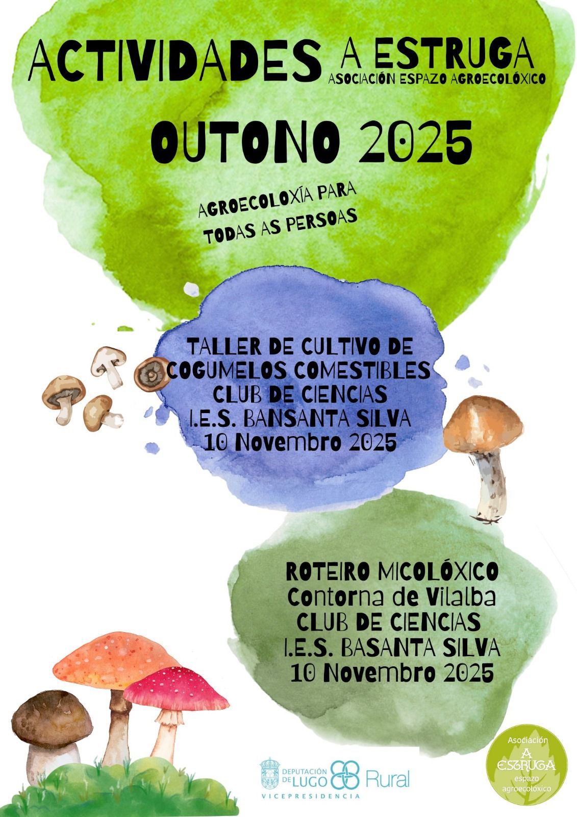 As dúas actividades principais desenvolveranse o 10 de novembro no IES Basanta Silva, dentro do Club de Ciencias do centro educativo. A primeira delas será un taller de cultivo de cogomelos comestibles, no que o alumnado aprenderá as técnicas básicas para producir fungos de forma sostible e respectuosa co medio. Pola tarde, está previsto un roteiro micolóxico pola contorna de Vilalba, que permitirá identificar especies autóctonas e comprender o seu papel ecolóxico nos bosques chairegos.