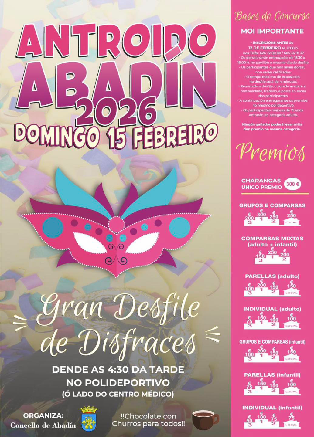 O Concello de Abadín organiza para o domingo 15 de febreiro o seu popular Entroido onde nenos e maiores poderán gozar a partir das 16.30 horas co tradicional desfile de disfraces que se levará a cabo no polideportivo, ao lado do centro médico.