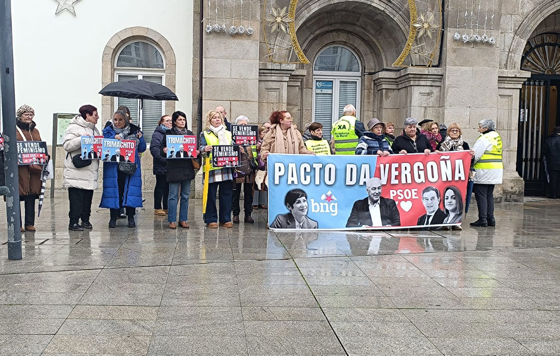 Pola súa banda, un grupo veciñas, principalmente vinculadas ás protestas de Becerreá, tamén se manifestou ao inicio do pleno da Deputación, tal e como veñen facendo ata o de agora, en contra do pacto de PSOE e BNG, que permitiu tamén sacar adiante un regulamento para a nova residencia que consideran inxusto. Nesta ocasión as proclamas foron defendendo o feminismo e contra "o pacto da vergoña", no que incluiron a José Tomé, Ana Pontón, Gómez Besteiro e Carmela López.