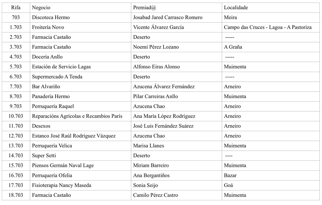 O sorteo estivo vinculado ao número premiado no Gordo da Lotería do Neno, que este ano foi o 06.703. Segundo informou a directiva do colectivo empresarial, os vales localizados serán entregados nun acto que terá lugar ás 20.00 horas no local que a asociación ten na Casa da Cultura de Muimenta.