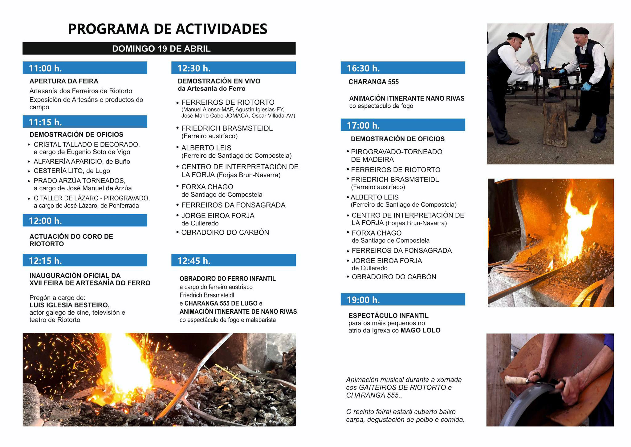 Ás 12.00 horas terá lugar a actuación do coro de Riotorto, que dará paso ás 12.15 horas á inauguración oficial da XVII Feira de Artesanía do Ferro. O pregón correrá a cargo de Luis Iglesia Besteiro, actor galego de cine, televisión e teatro natural do propio concello.
