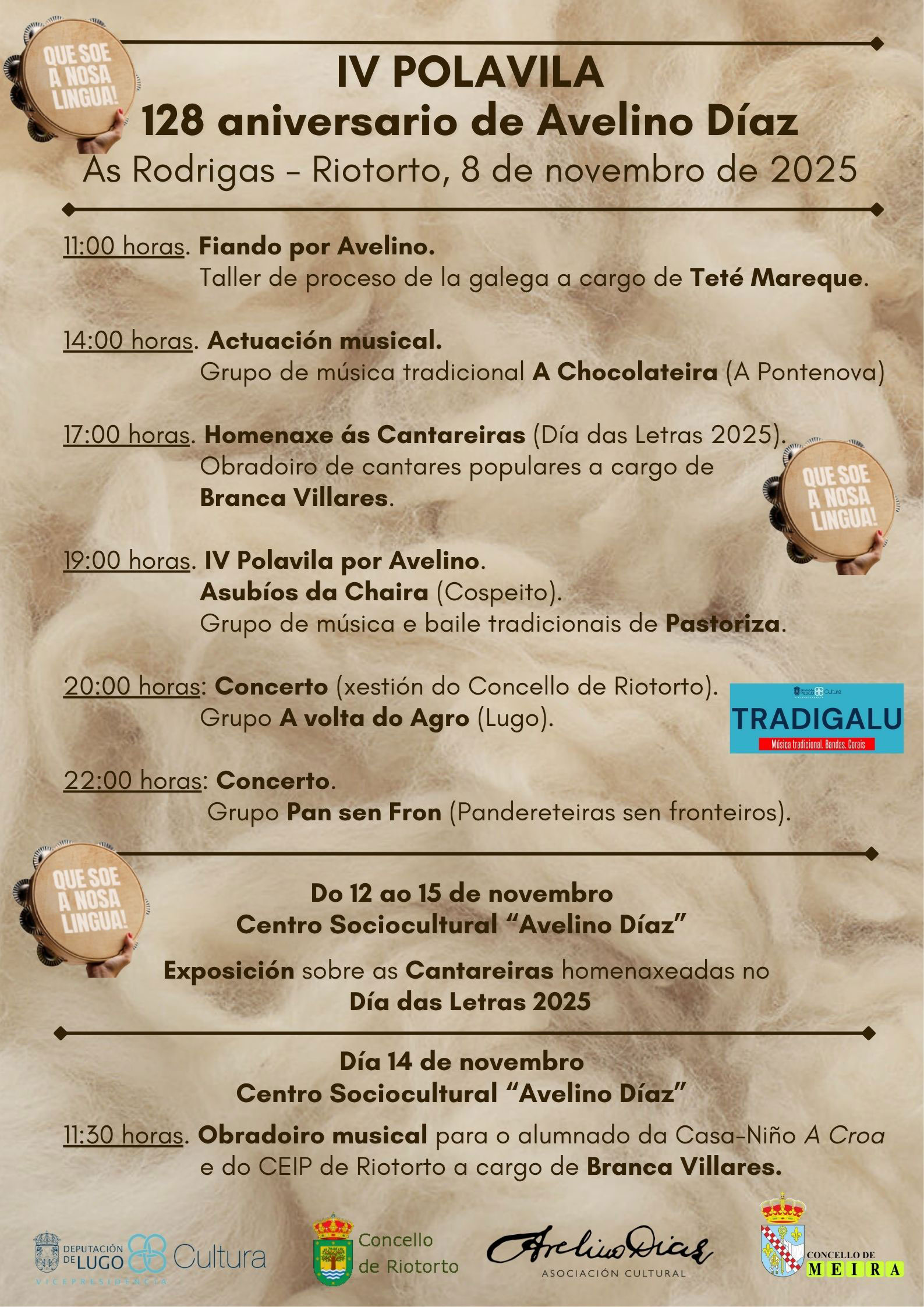 Pola tarde, ás 17:00 horas, celebrarase unha homenaxe ás Cantareiras, coincidindo co Día das Letras Galegas 2025, cun obradoiro de cantares populares dirixido por Branca Villares. Ás 19:00 terá lugar a propia IV Polavila por Avelino, coa participación de Asubíos da Chaira, de Cospeito, e dun grupo de música e baile tradicional da Pastoriza.