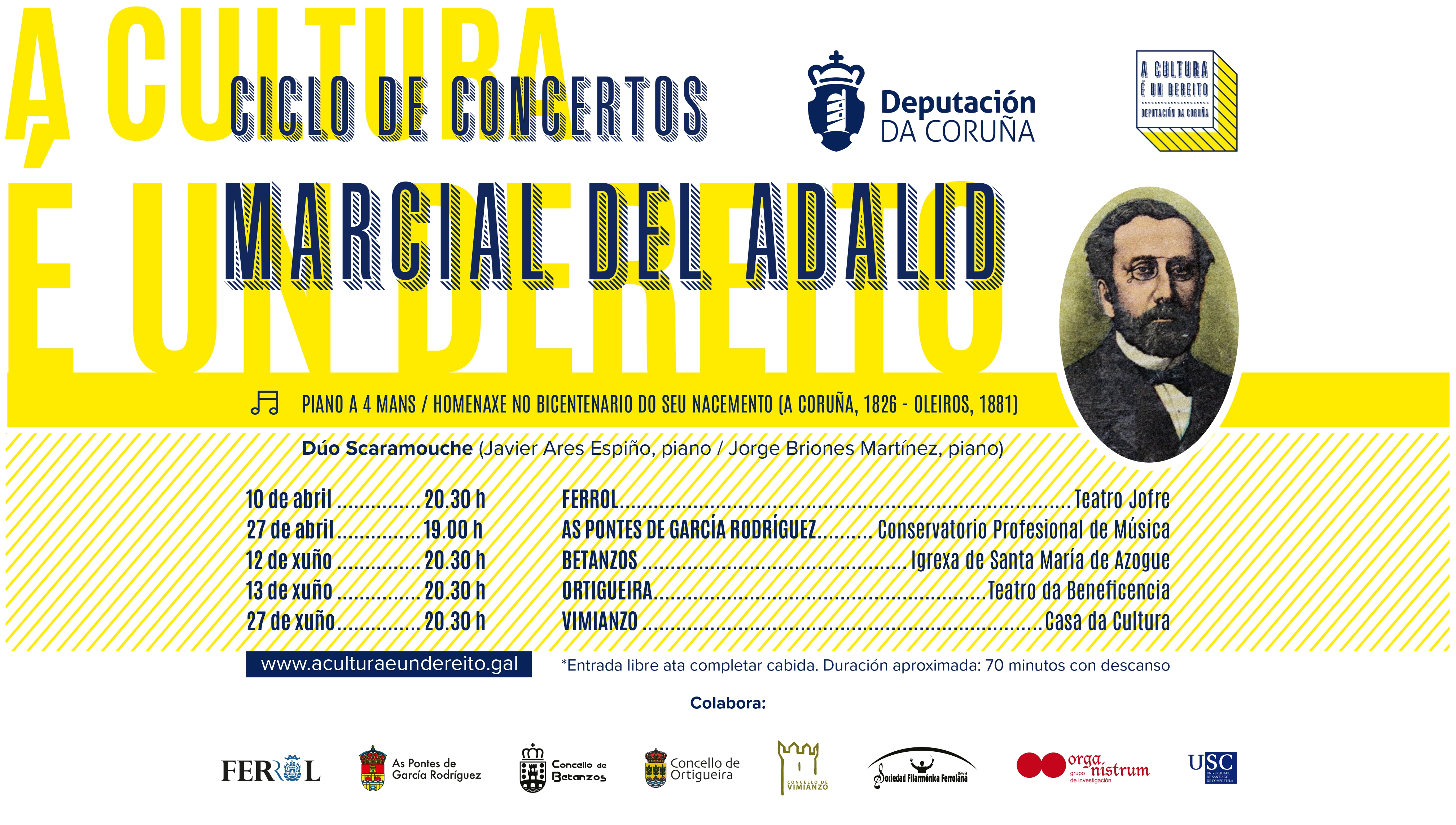 A música de Marcial del Adalid volverá soar con especial forza este ano na provincia coa posta en marcha do ciclo 'Marcial del Adalid. Piano a catro mans', promovido pola Deputación da Coruña no marco do bicentenario do seu nacemento. A proposta percorrerá Ferrol o 10 de abril, As Pontes o 27 de abril, Betanzos o 12 de xuño, Ortigueira o 13 de xuño e Vimianzo o 27 de xuño, sempre da man do Dúo Scaramouche, formado por Javier Ares e Jorge Briones. A primeira cita será no Teatro Jofre de Ferrol ás 20.30 horas.