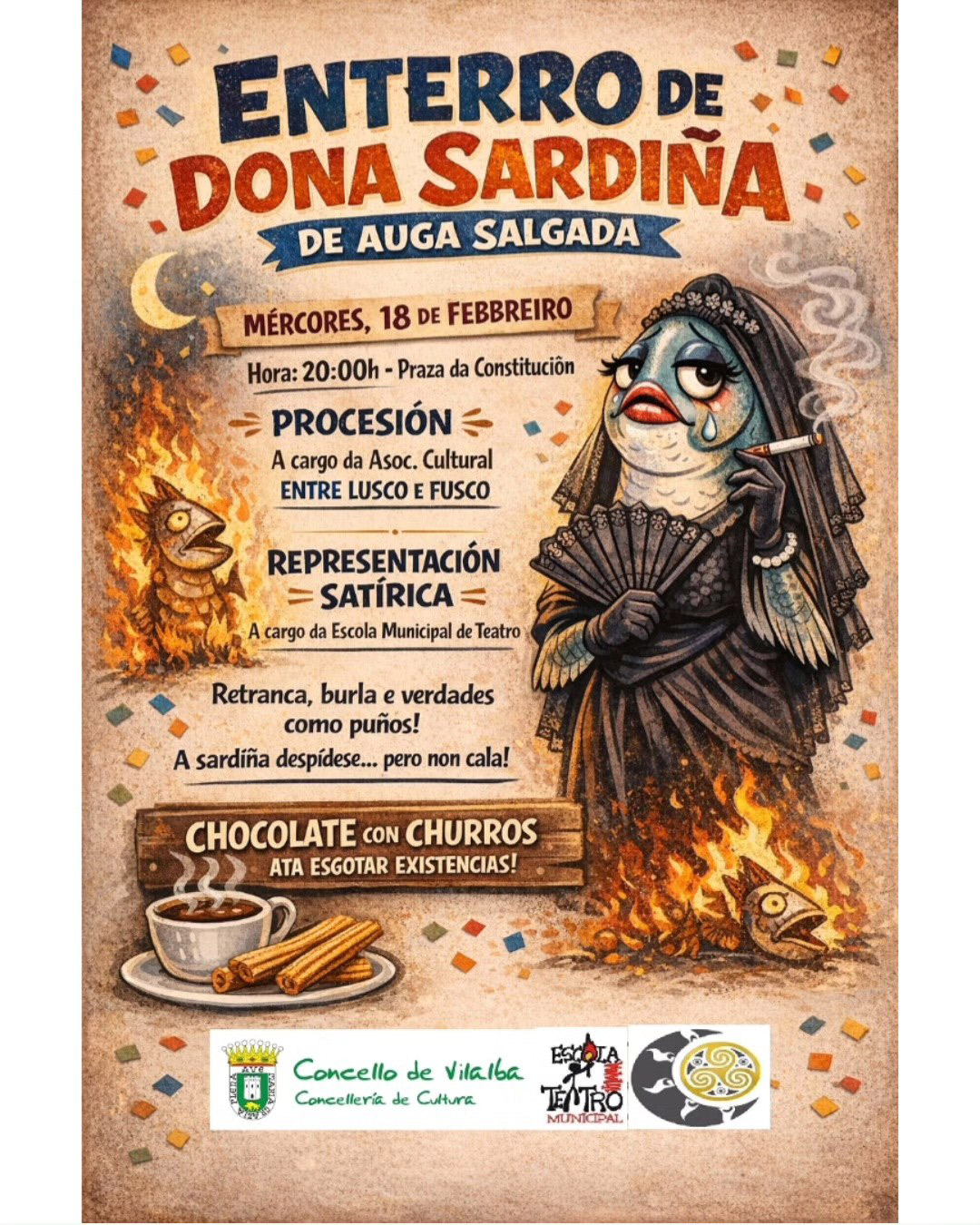 Vilalba celebrará o tradicional Enterro da Sardiña hoxe mércores, a partir das 20.00 horas na Praza da Constitución, nun acto co que se porá o broche final ás festas do Entroido. A convocatoria combinará tradición, sátira e participación popular nun ambiente festivo aberto a toda a veciñanza.